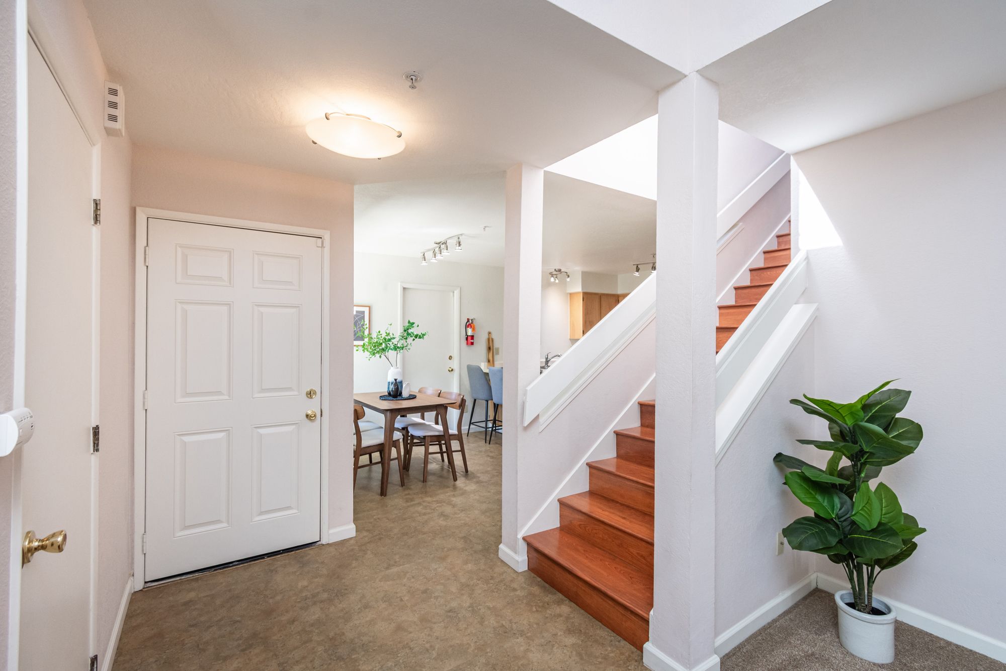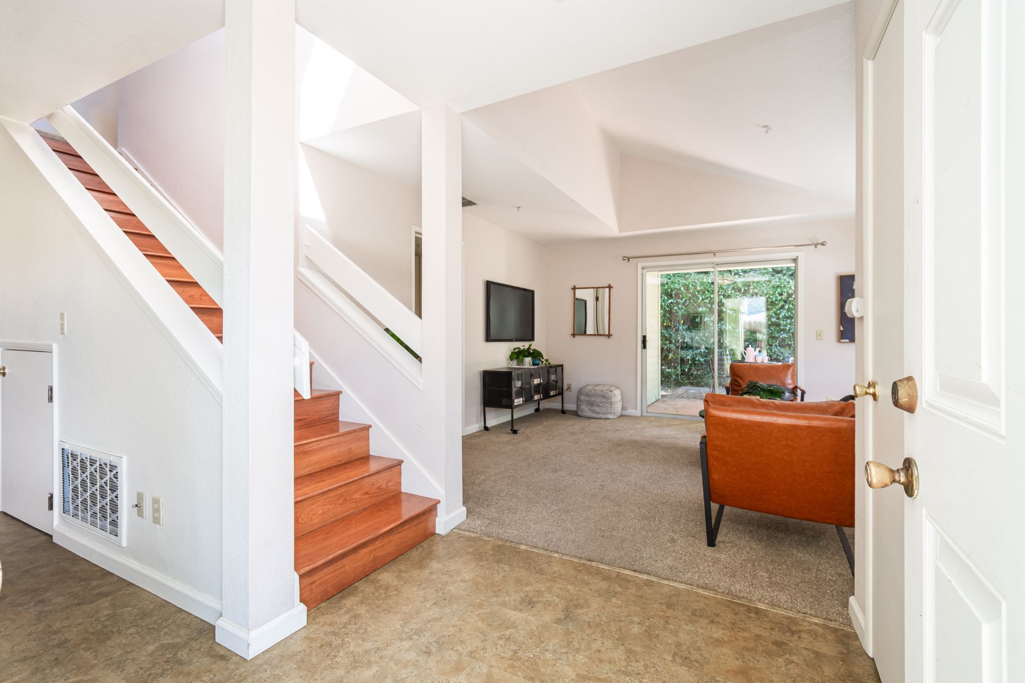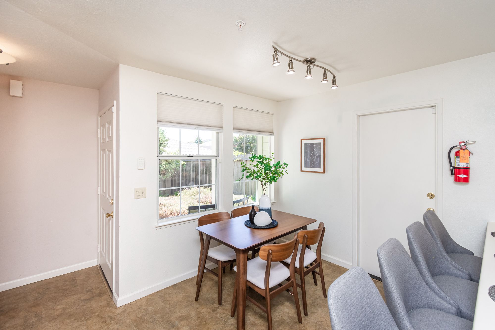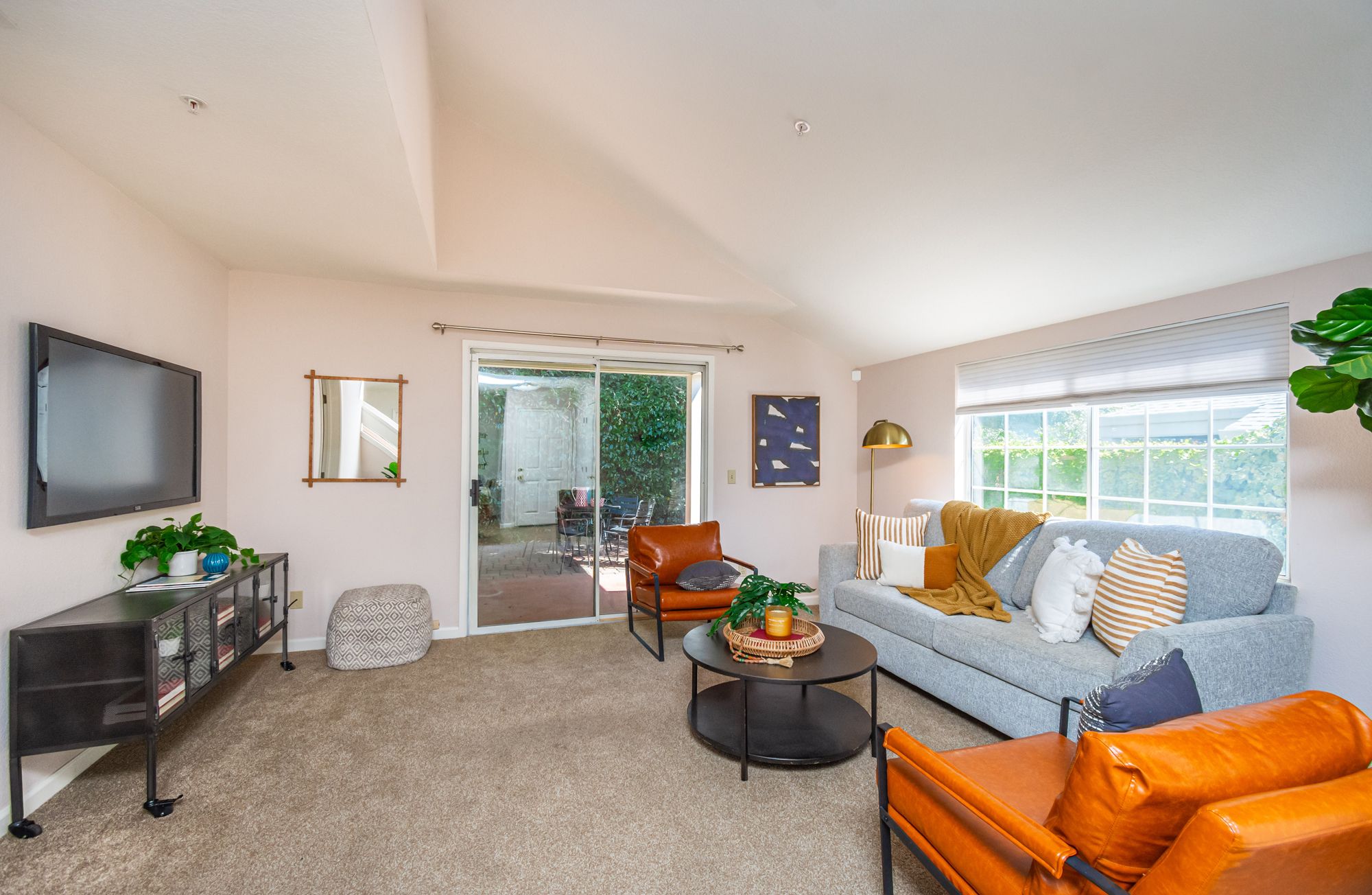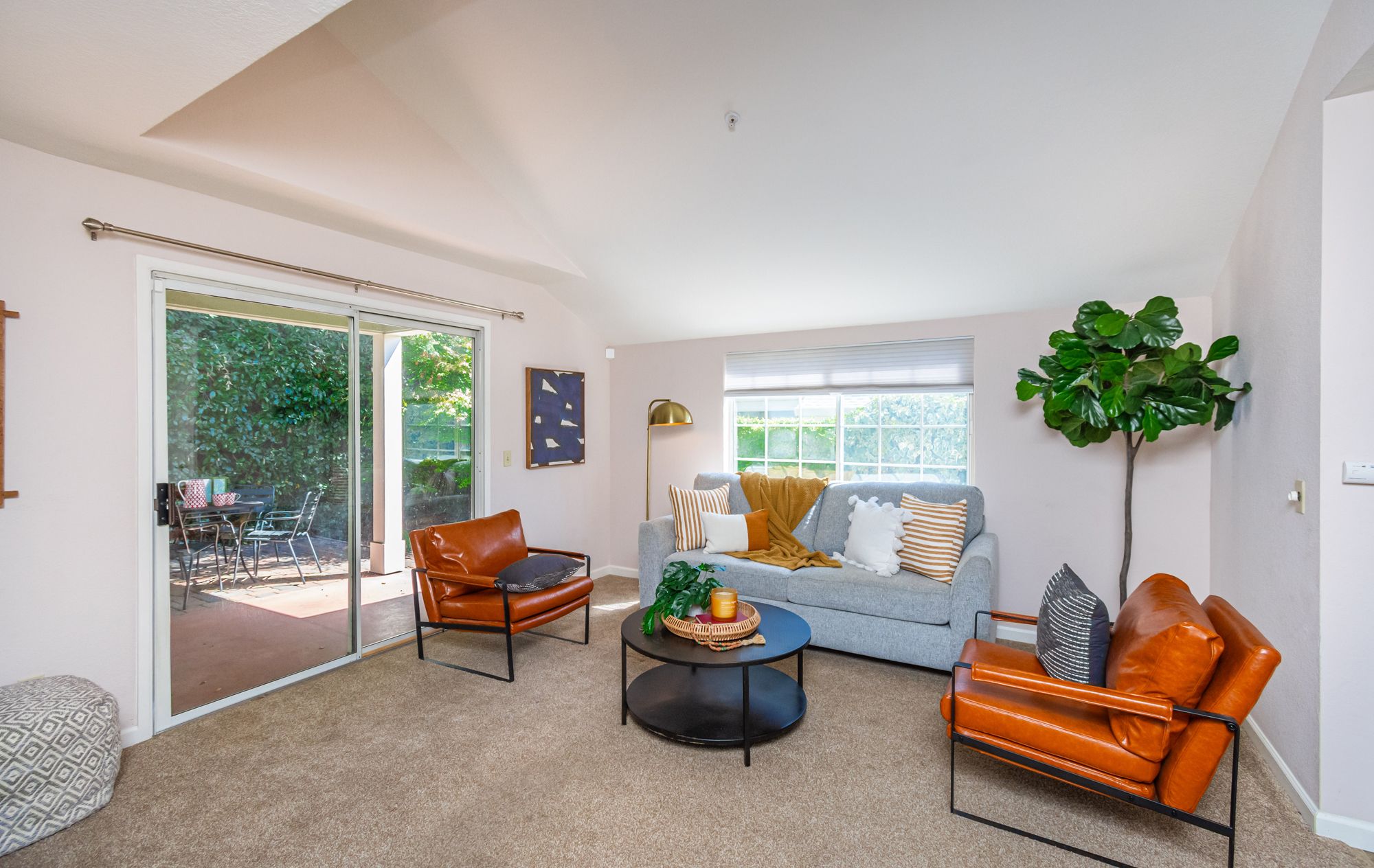 Discover effortless living in this immaculate townhome, perfectly situated in the heart of Napa Valley. This 3-bedroom, 2-bathroom home is filled with natural light, and a bright, airy atmosphere. The eat-in kitchen is thoughtfully designed for efficiency, featuring generous storage and counter space. The adjoining dining area seamlessly flows into the family room, where glass doors open to a wraparound yard, ideal for indoor-outdoor living and entertaining. A downstairs primary bedroom with full bath offers comfort and flexibility, while upstairs you’ll find two spacious bedrooms with large closets and scenic mountain views. Outside, inviting spaces filled with fragrant blooms and a large back patio, perfect for al fresco dining. The two-car detached garage includes storage racks for added convenience. Residents enjoy gated access to the river trail and close proximity to shopping, dining, and everyday essentials. This townhome presents a rare opportunity to embrace a carefree, convenient Napa Valley lifestyle in a beautifully maintained setting.