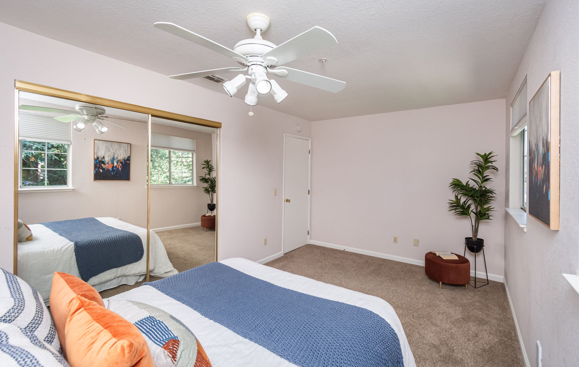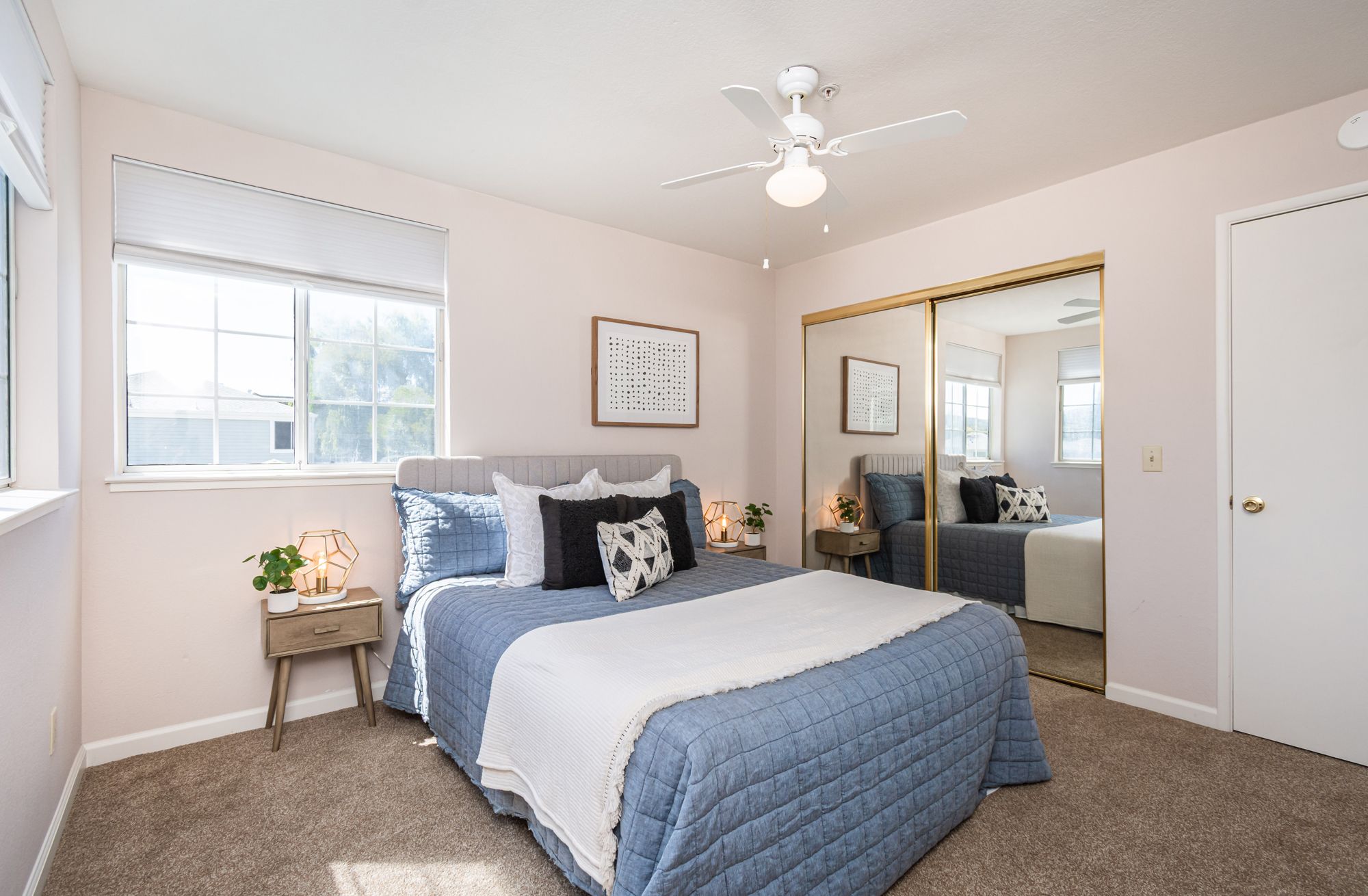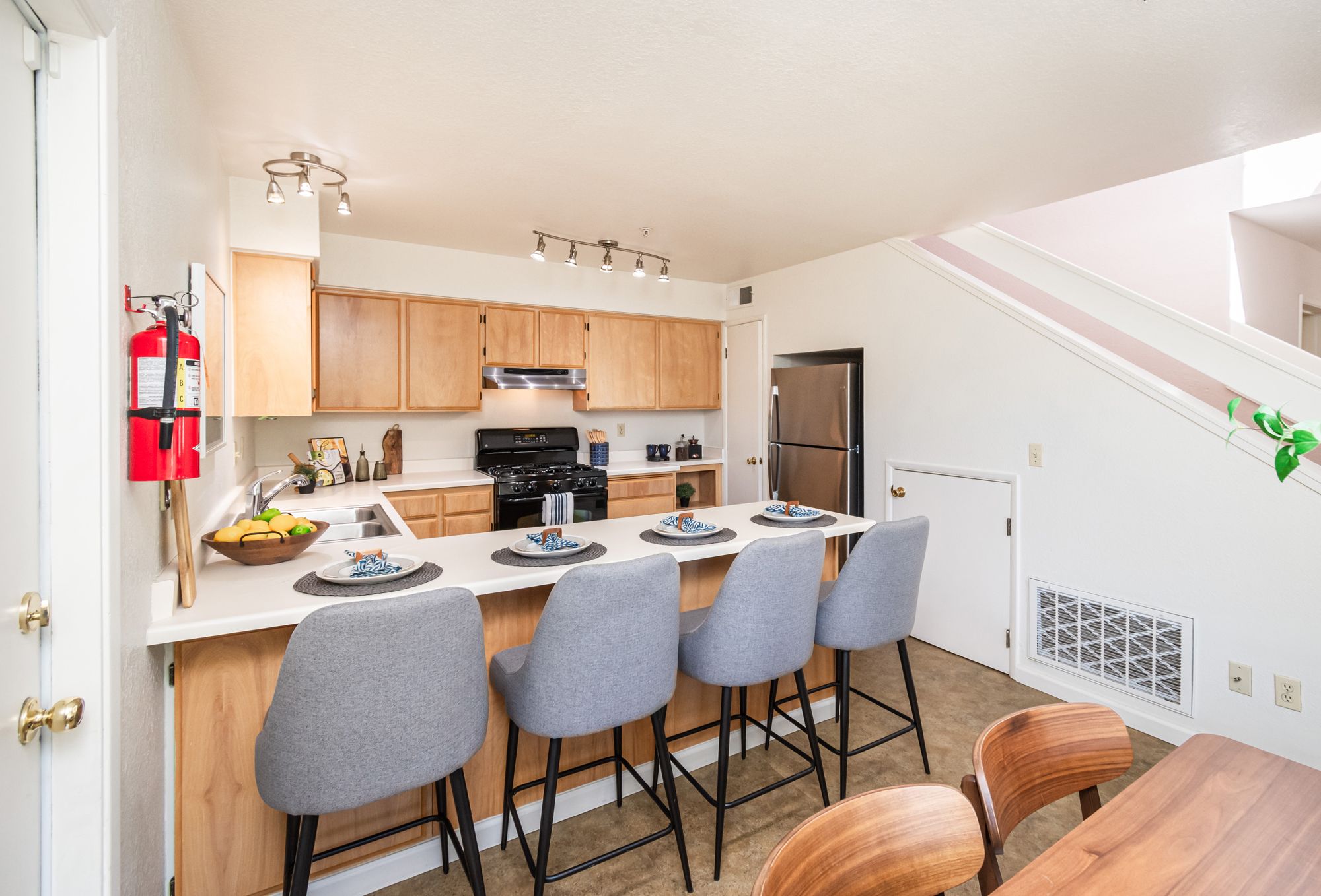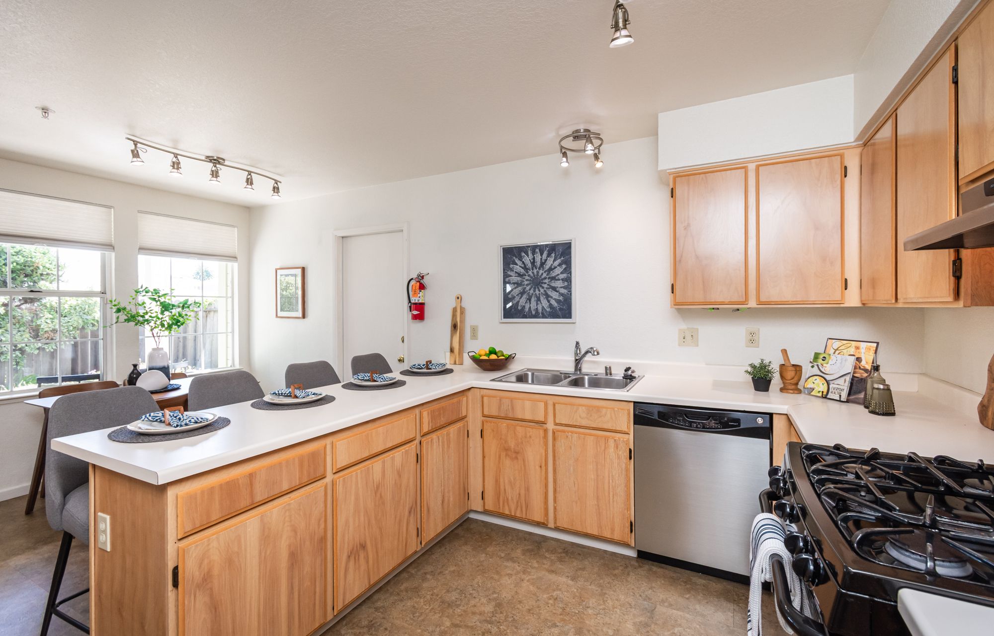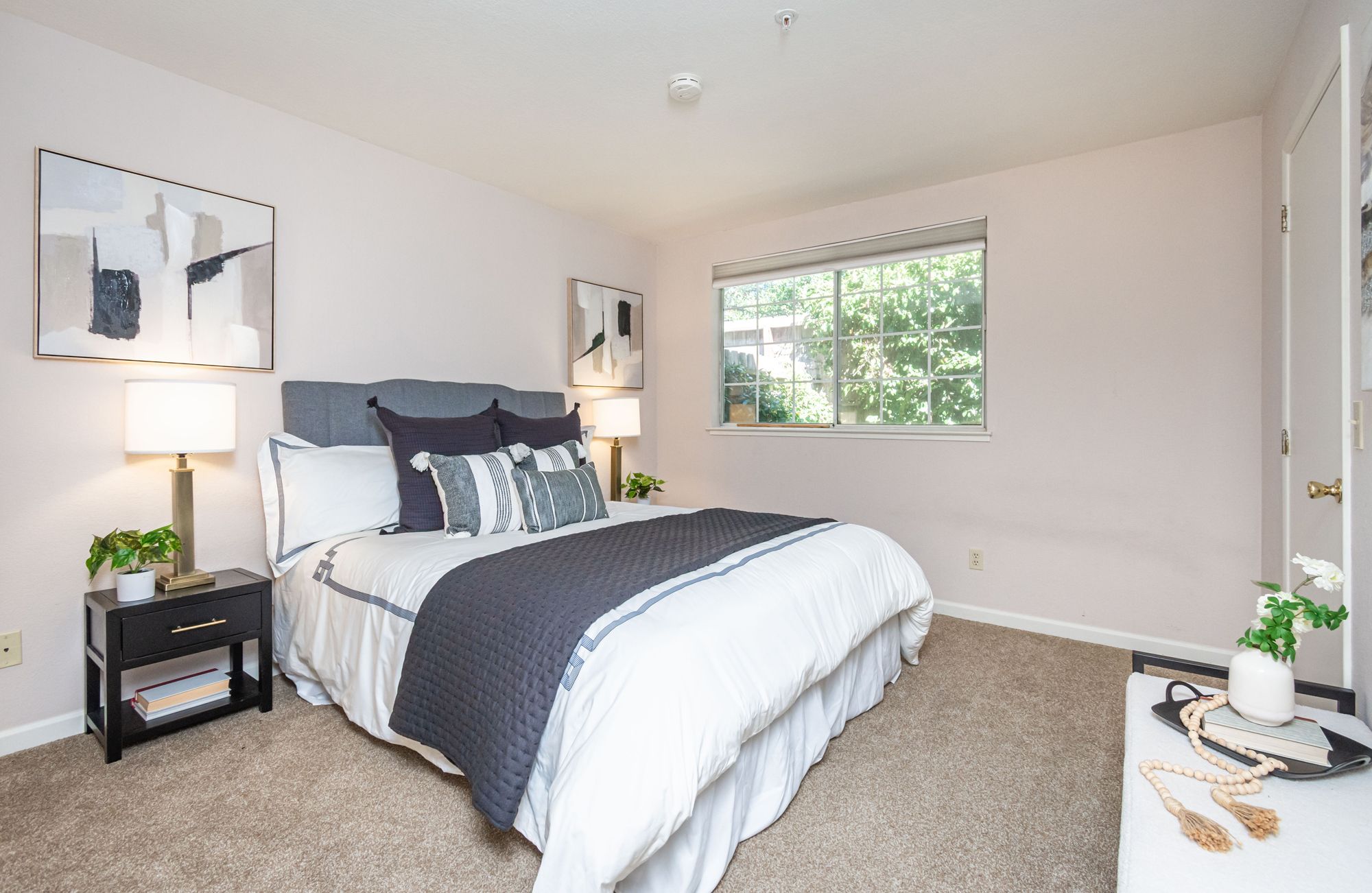 Discover effortless living in this immaculate townhome, perfectly situated in the heart of Napa Valley. This 3-bedroom, 2-bathroom home is filled with natural light, and a bright, airy atmosphere. The eat-in kitchen is thoughtfully designed for efficiency, featuring generous storage and counter space. The adjoining dining area seamlessly flows into the family room, where glass doors open to a wraparound yard, ideal for indoor-outdoor living and entertaining. A downstairs primary bedroom with full bath offers comfort and flexibility, while upstairs you’ll find two spacious bedrooms with large closets and scenic mountain views. Outside, inviting spaces filled with fragrant blooms and a large back patio, perfect for al fresco dining. The two-car detached garage includes storage racks for added convenience. Residents enjoy gated access to the river trail and close proximity to shopping, dining, and everyday essentials. This townhome presents a rare opportunity to embrace a carefree, convenient Napa Valley lifestyle in a beautifully maintained setting.